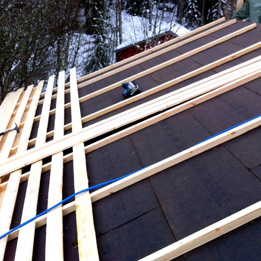 Sistema per tetto su perlinato in fibra di legno Therm e fibra di legno bitumata ad elevata densità e resistenza a compressione e strato in cementolegno BetonWood. Strato ventilato garantito da un sistema di travi in legno.