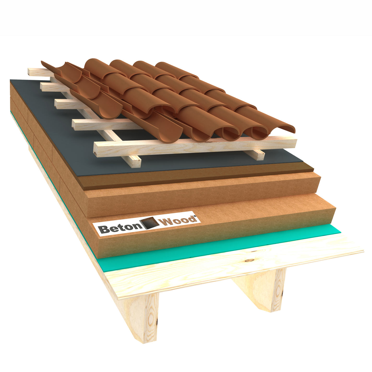 Sistema per solaio in fibra di legno ad elevata densità e resistenza a compressione FiberTherm BitumFiber e pannelli in cementolegno BetonWood.